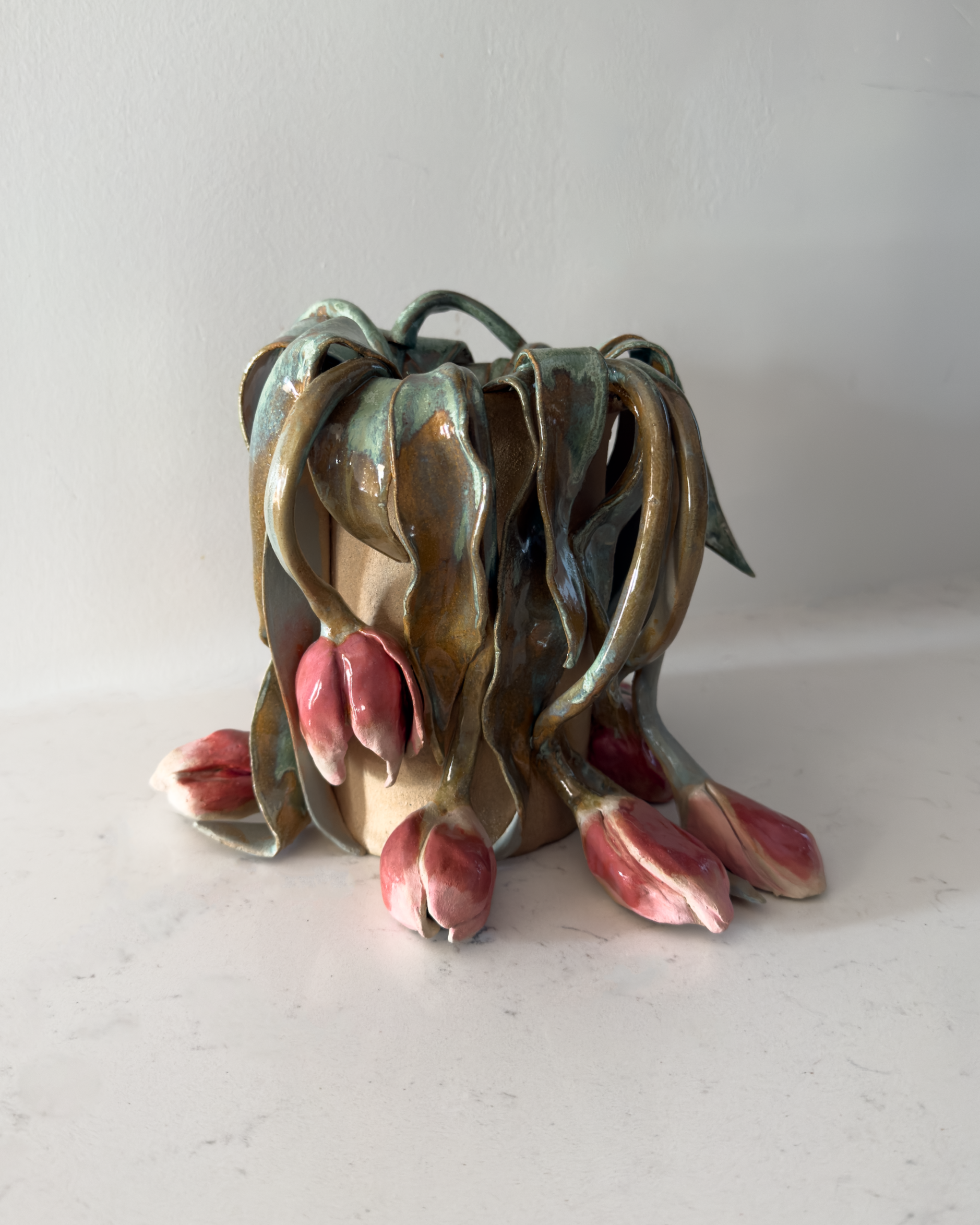 The tulip series began one fateful day when my building’s 100 year old boiler kicked on to full blast and left my freshly cut tulips limp with sudden heatstroke. Struck with a combination of grief and awe, the image of their lifeless forms heavy and draped over one another stayed with me for almost a year until I decided to reimagine it in clay.